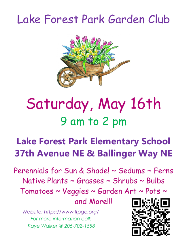 Our annual plant Sale will be held on Saturday, May 16th from 9 am until 2 pm or until we sell out. Find us at Lake Forest Park Elementary School 18500 37th Ave NE,